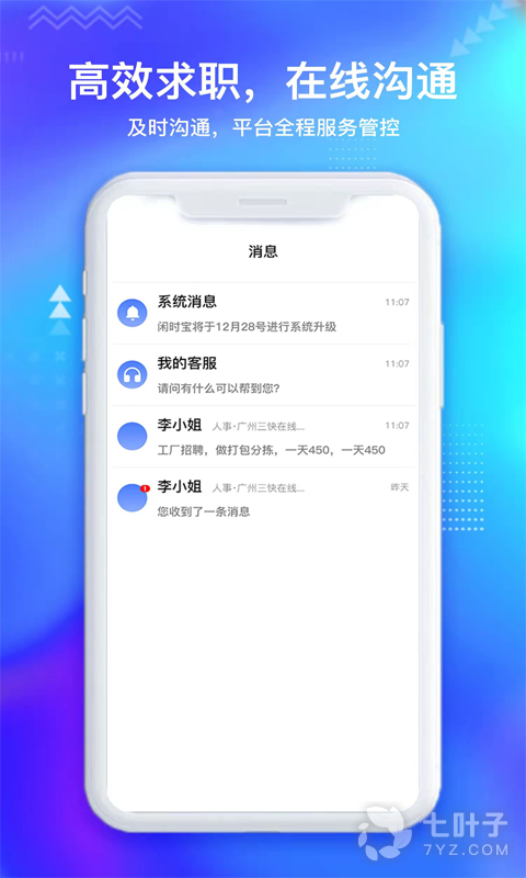 1、闲时宝就业版有丰富的岗位,支持在线沟通,有效提高求职办公效率,高效求职,薪资实时结算