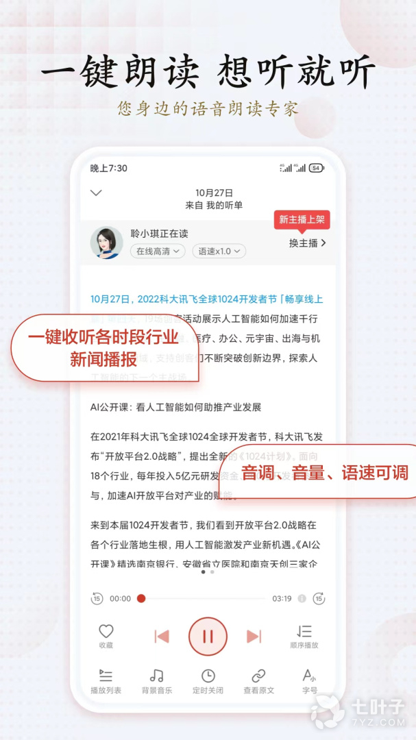 讯飞有声,科大讯飞荣誉出品,利用先进的语音合成技术,提供更加自然的朗读音质,没有生硬的朗读效果,不会卡壳卡顿,给您宛若真人般朗读的聆听体验,真正实现“我喜欢看的都能听”。