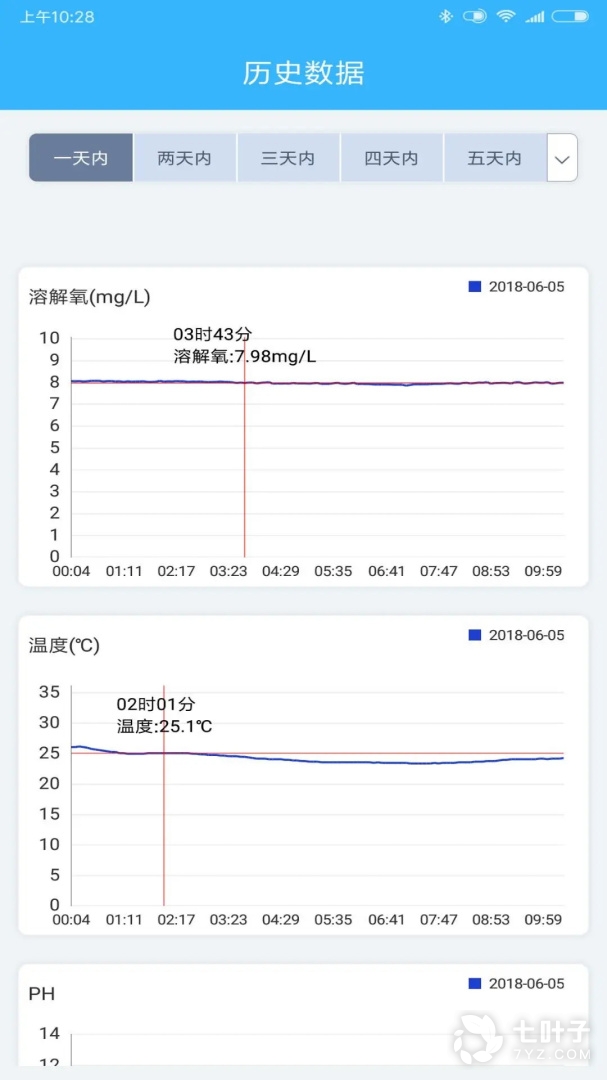 3、支持查看池塘近一周的溶解氧、温度、PH等变化情况,还有相应的图片解析;