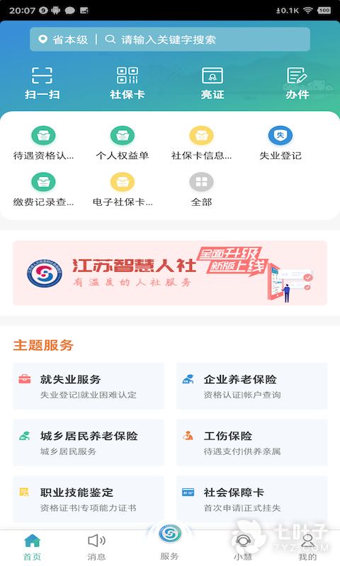 江苏智慧人社集成全省各地人社业务服务,公众可通过江苏智慧人社申领全国统一的电子社保卡,查看个人所持人社部门颁发的各类证照,在线办理各类业务,江苏智慧人社为公众提供全业务、全天候、全地域的人社移动服务。