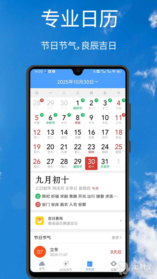 【日历天气】显示温度趋势、降雨趋势,日历模式显示未来15天的天气信息、黄历宜忌数据、二十四节气、节假日于一体,传统节日随时随地查看;