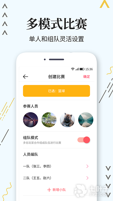 1,创建比赛-选择一种比赛类型,点击后,进入房间等待界面,选择加号邀请好友参赛,设置单人或组队模式,如果没有您要的比赛分类,可以使用自定义功能创建比赛名称。