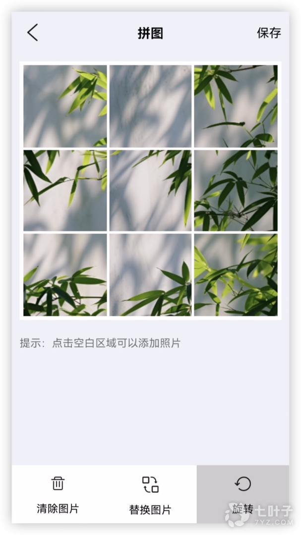 2、强大的拼图功能:支持对单张图片进行替换、旋转、翻转、缩放、拖动交换等功能