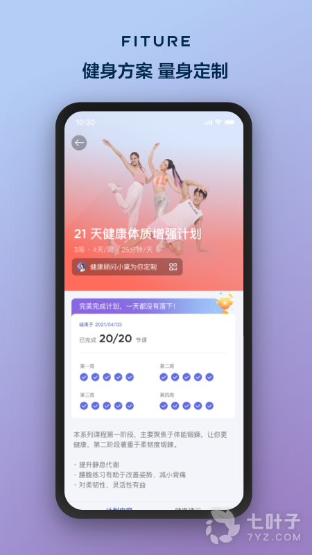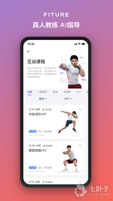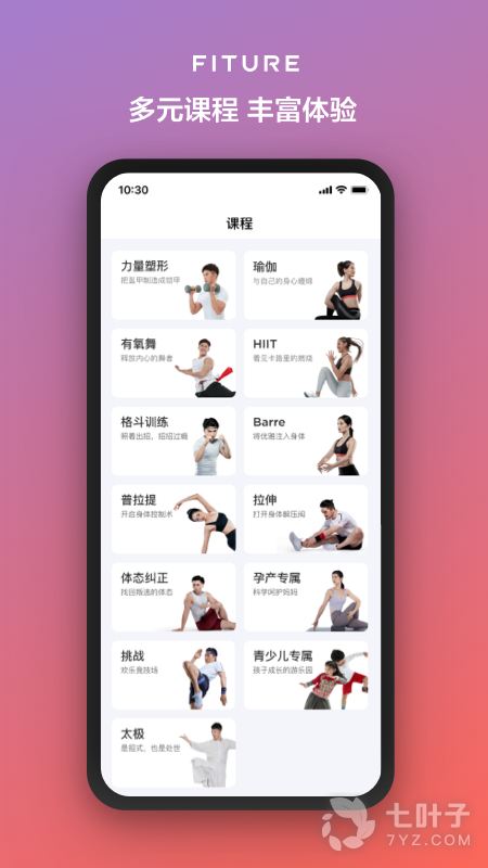 2.明星教练陪伴,在家即享精品健身课程体验,fiture内容团队与专业明星教练精心打磨,涵盖近千余节课程,同时适宜儿童、成人、年长者等各个年龄段。
