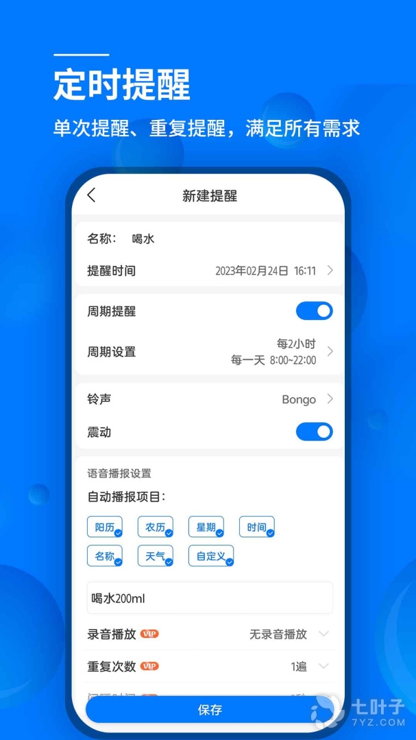 1、语音报时闹钟app支持整点报时、半点报时、自定义任意时刻报时、间隔无限报时、倒计时。