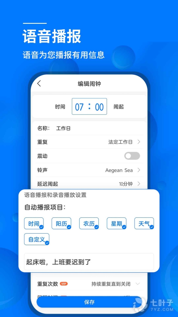 3、语音闹钟是一款小巧实用的手机语音闹钟,支持语音报时,界面简洁,专注闹钟功能,自定义铃声或真人语音报时模式,自定义报时文字,简单好用
