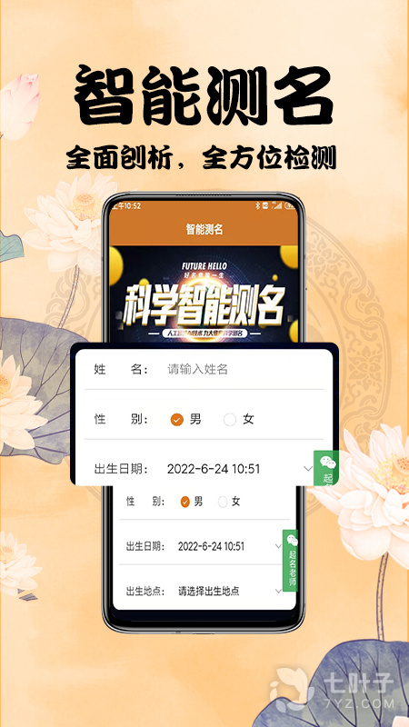3、在测试界面直接输入名字就可以进行测试了。在起名的时候,你可以选择不同的条件,比如出生日期、性别等