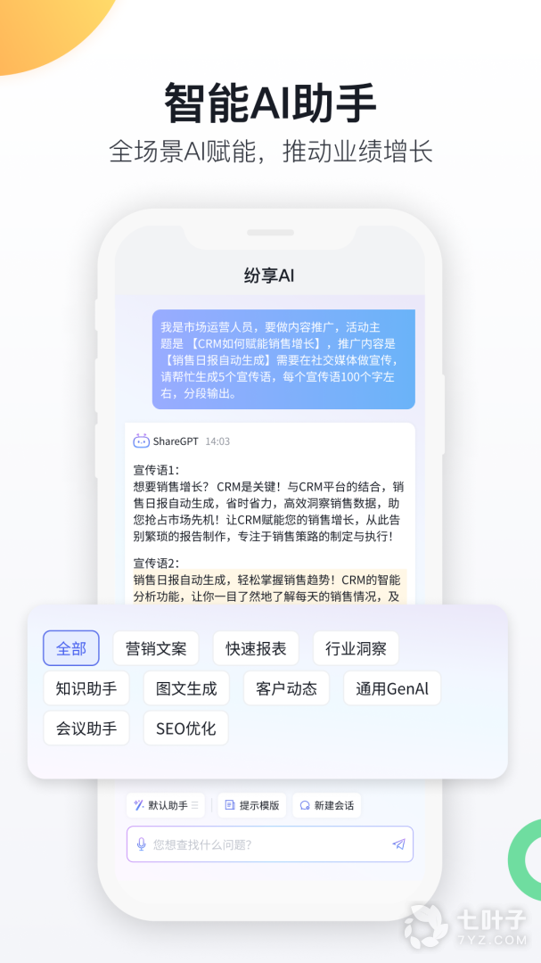 2、纷享销客具有强大的协同办公能力,并且与自身的CRM业务和企业互联业务紧密连接,通过企业级 IM即时通讯、OA协同,主要包括考勤、外勤、审批、日志、日程管理、工作台、业务助手等系列办公应用,将企业内部和产业链上下游连接起来,让业务与人紧密连接,相互驱动,让人围绕业务高效协同,诠释了纷享销客独一无二的“连接型CRM”基因