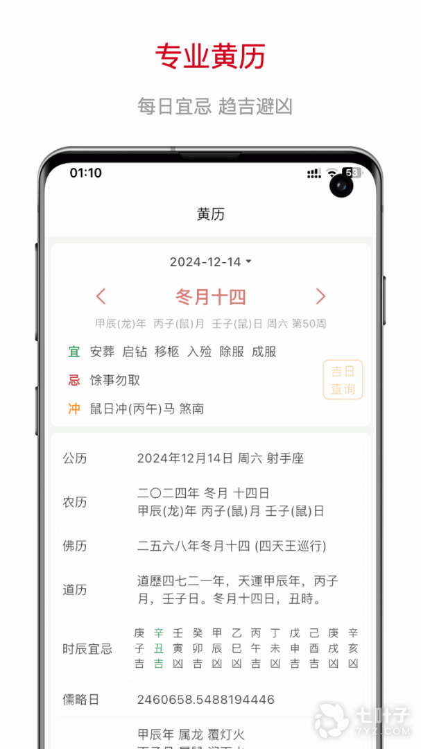 2、老黄历相关:每日吉凶宜忌,节气时令,天干地支,知晓传统历法文化
