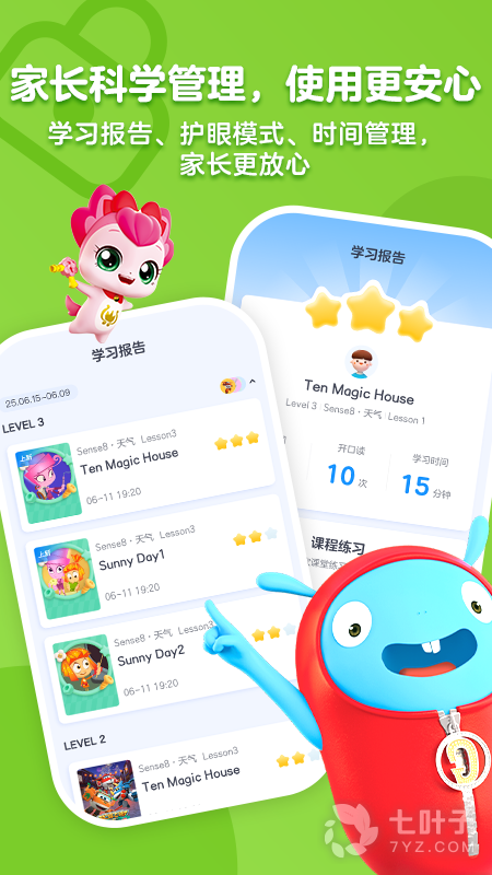 2、英语学习新增“成长计划”,结合英语生活场景词汇分级分阶有计划学习,生成孩子学习报告,掌握学习进度。