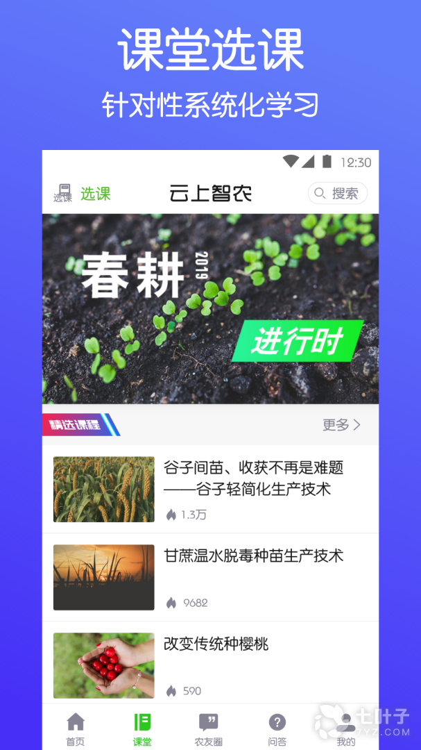 课堂板块目前课程数量超过12万余门,覆盖了大田粮食作物、水果、蔬菜、水产、畜牧、家禽、植保、种植、养殖、飞防、园艺以及经营管理多个领域。其中小麦、玉米、水稻、葡萄、苹果等课程获得东南亚农业国家农业博览会展映。