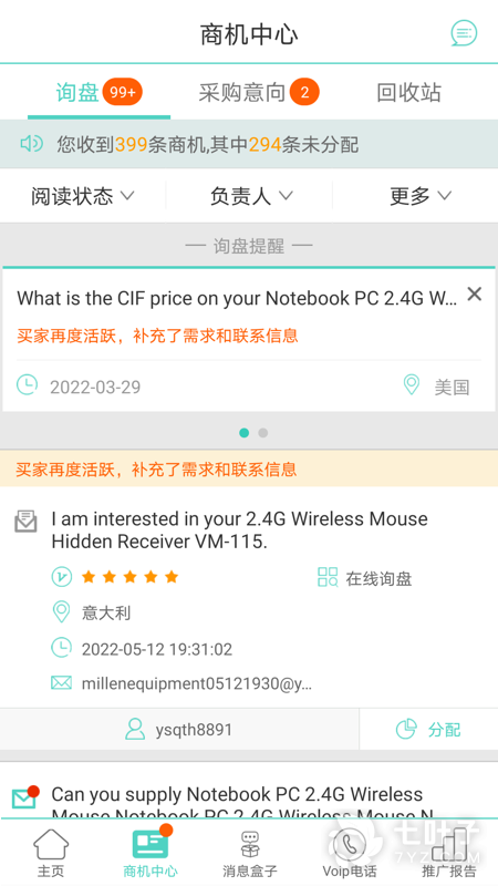 询盘中心:查看贸易通询盘,并进行询盘分配;