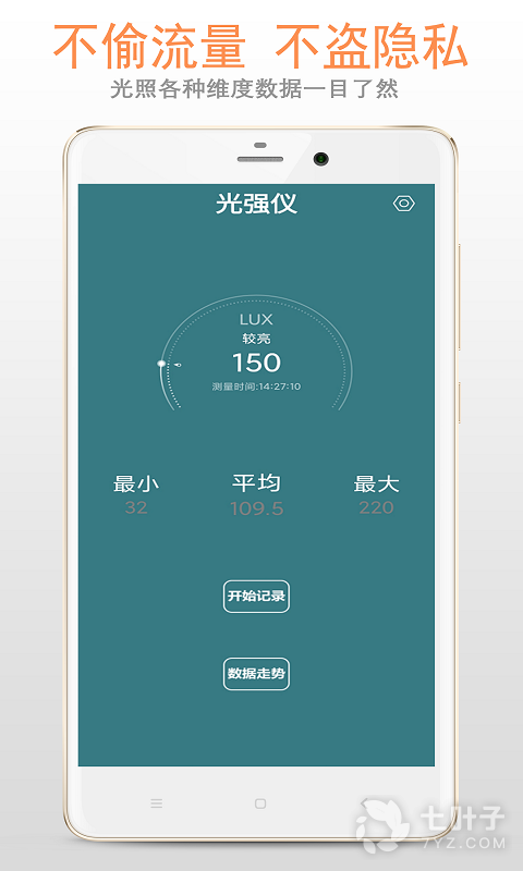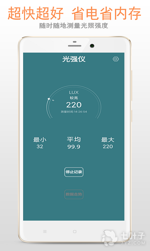 在这款光线测量应用程序上会显示从最低、真实及最高的测得数值,并绘出实时和平均照度趋势图表,为学习、工作和生活提供一个好理解又详尽的光线状况报告。