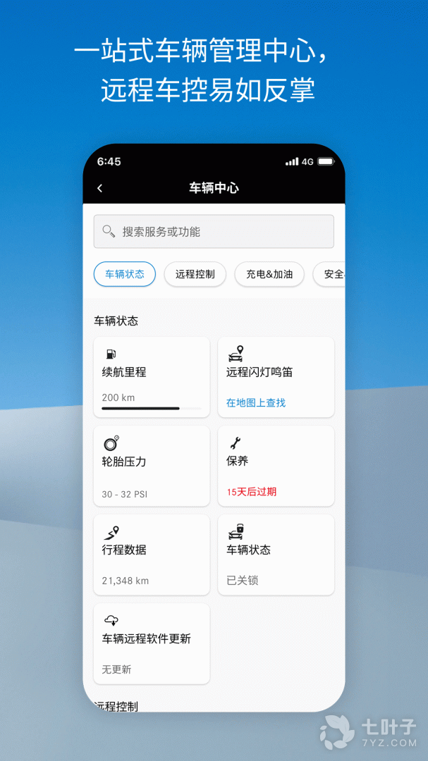 • 车辆状态查询(包括估算剩余里程,轮胎压力,燃油液位,蓄电池电量等信息)