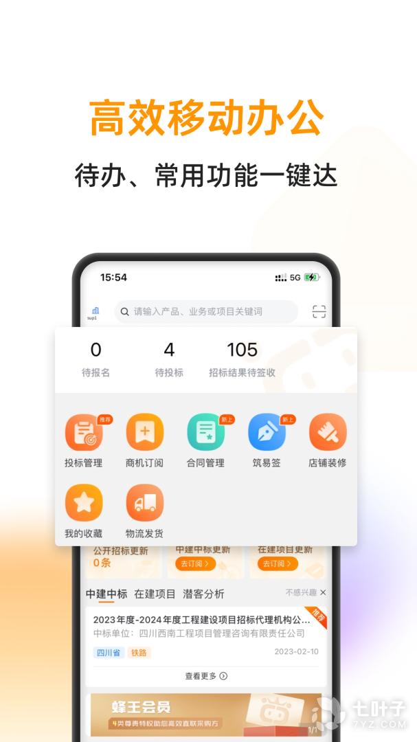 1、移动工作台您可以随时随地查看投标进度、收藏标讯,管理店铺主页,同时为您推荐海量商机信息