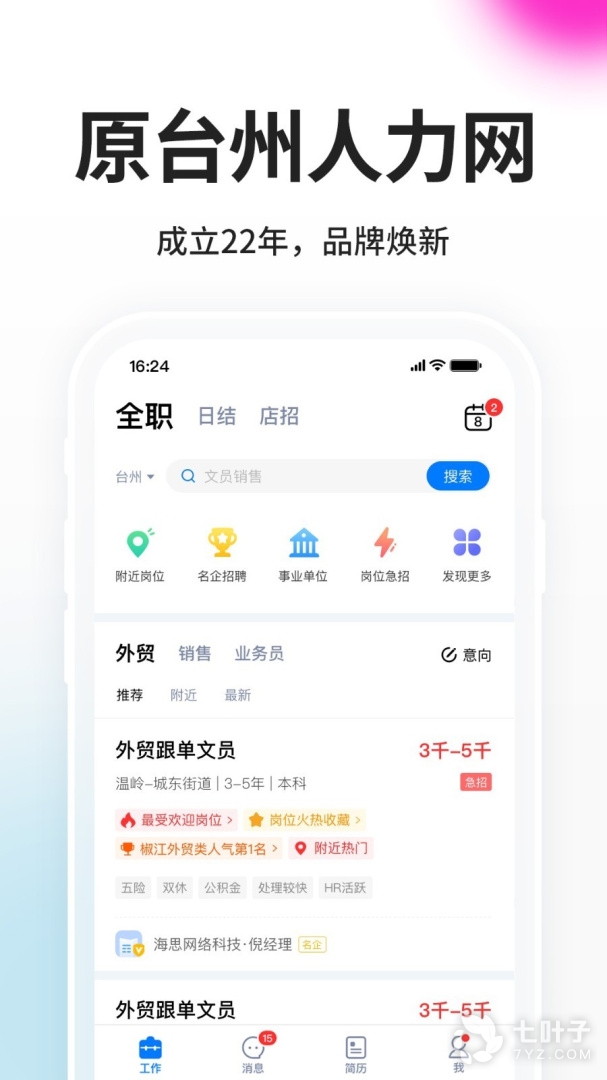 4、《台州人力网》app是一款优质的求职找工作平台,平台为用户提供了海量的招聘信息,涵盖各行各业,可满足不同行业、专业求职者的需求;每日实时进行更新,推荐你感兴趣的岗位,一键可投递多个岗位简历,可以让你快速找到满意的工作,节省大部分找工作时间,高薪工作手到擒来
