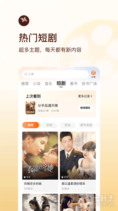 3、而且还有各种各样的小说类别,真正的小说是免费听和读的,每天都有大量的小说章节更新,还有一个流行小说资源列表供您选择,同时可以通过一次点击缓存离线听书,告别任何限制,感兴趣的下载去体验吧