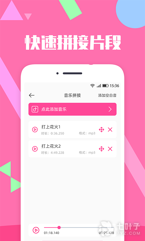 2、音乐拼接,选择自己喜欢的音乐片段剪辑拼接为一体,串烧喜欢的歌曲吧