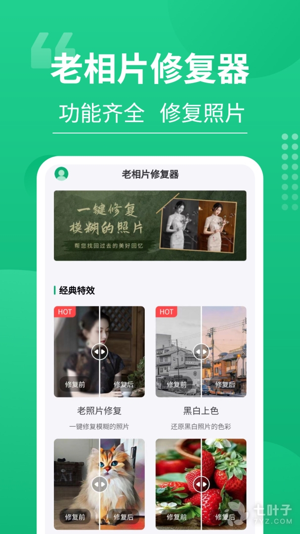 2、老相片修复器运用强大的AI识别技术,老相片修复器软件能够智能修复老旧照片。使用老相片修复器最新版可让老旧照片重新恢复色彩