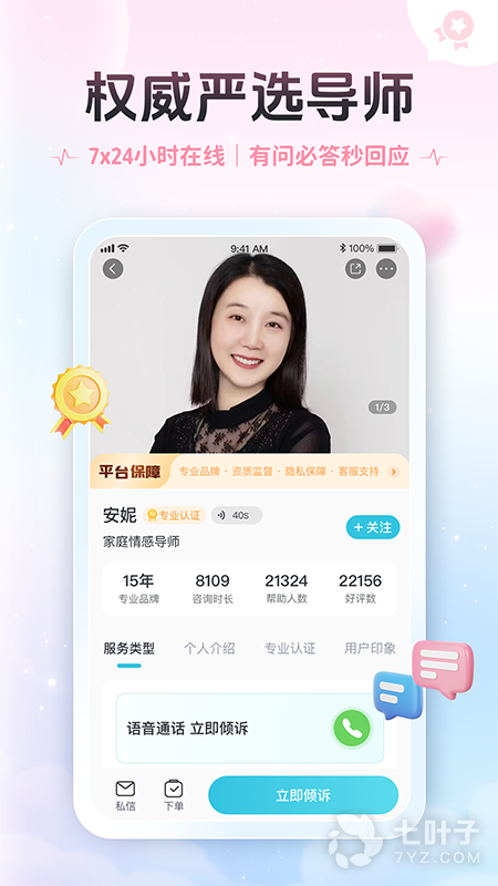 6、专业权威,师资强大中科院心理研究所专家牵头,严选咨询师、专业团队审核、活体认证、上岗培训,全方位把关,确保心理咨询师专业服务水平