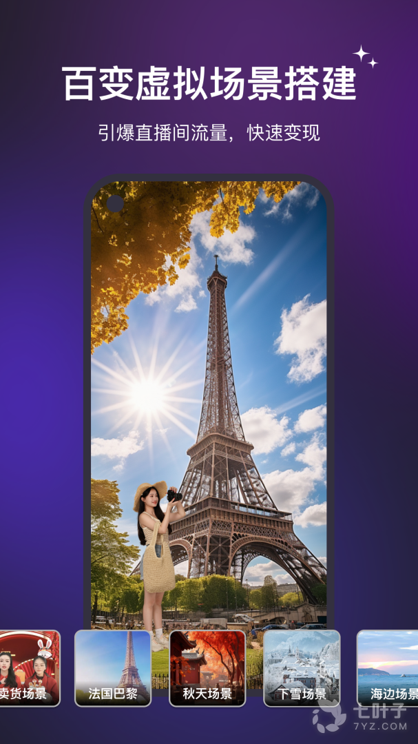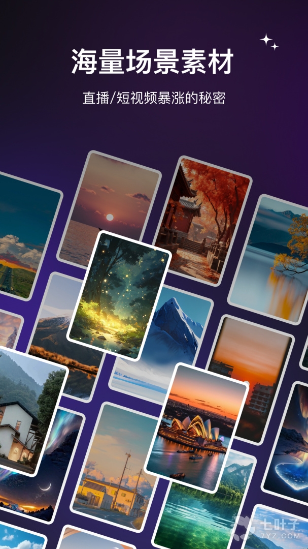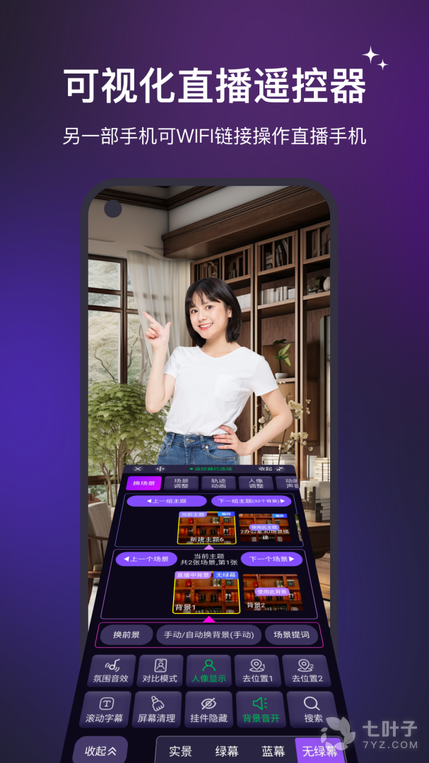 1、让您只需动动手指即可切换相关场景,虚拟背景&音效氛围,上千款网红素材