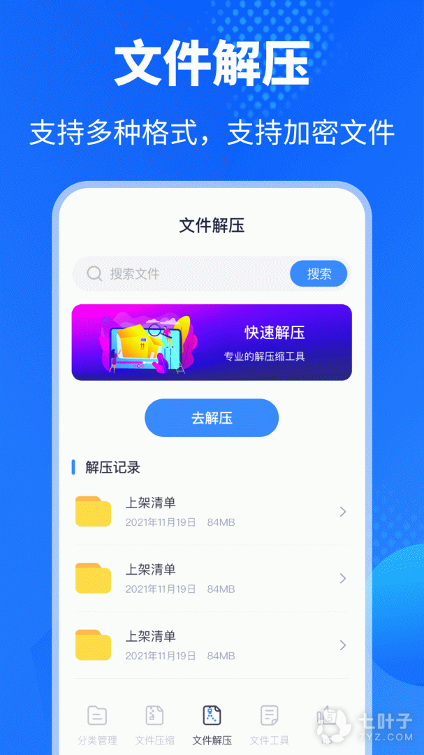 解压缩助手支持zip和7z两种格式的压缩。解压格式全,解压速度快。解压缩助手同时还支持分卷解压缩,解压缩助手支持多种压缩级别等,支持解压进度查看。能够快速的帮助用户对手机的压缩文件进行智能的扫描,所有的文件都可以智能的分类,一键解压一键压缩,非常的方便,让你可以快速的处理各种文件,并且支持多种文件格式,实时查看解压进度。