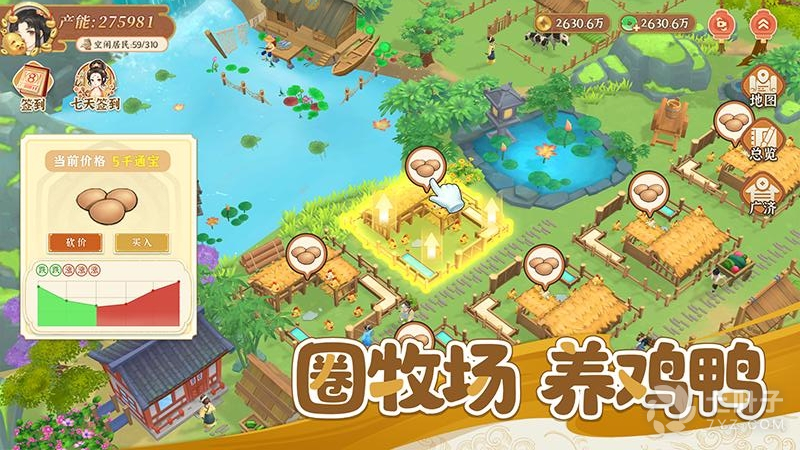 2、游戏中的地图非常的广阔,里面有许多个场景,玩家进入游戏等于穿越回古代了,在里面需要按照剧情任务来找到生存的办法,需要去田地里面干活种植农作物,在赶集的时刻拿到街上去售卖还有非常多的玩法