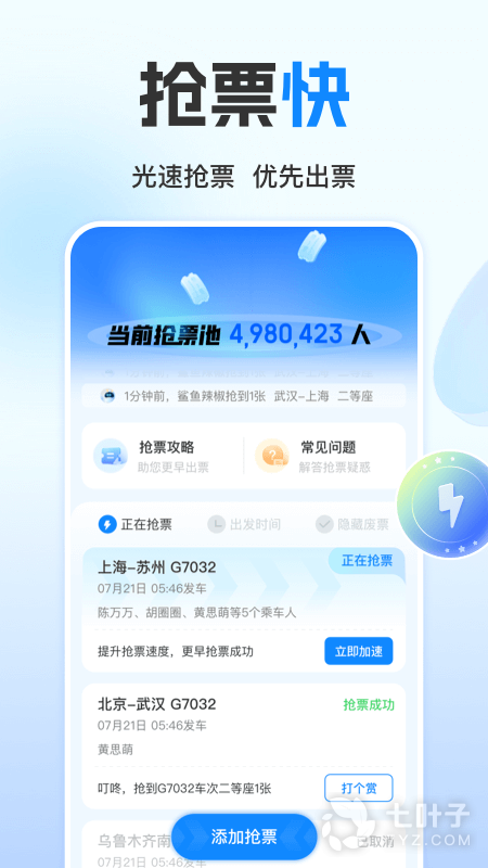 • 提速宝抢票:热门线路用提速宝加速
