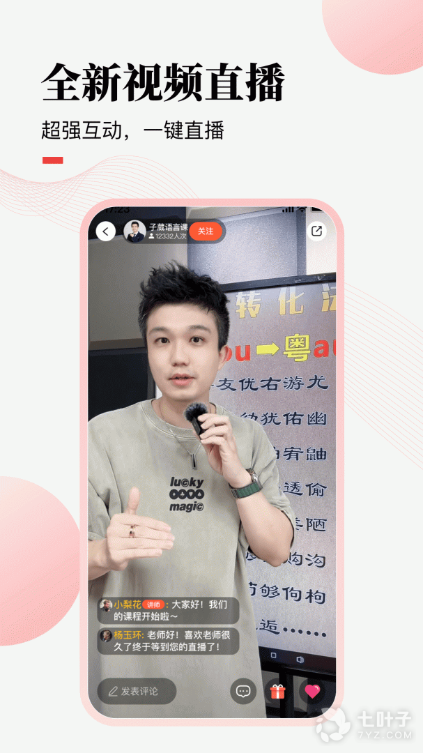 直播间页面:课堂展示多元化,语音自动连播无卡顿,师生互动无界限。
