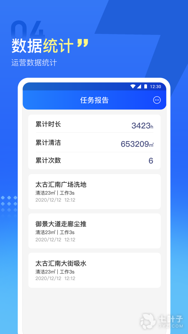 7、掌上高仙可查看机器历史运行数据,累计工作时长、清洁面积和清洁次数,以及每次任务报告
