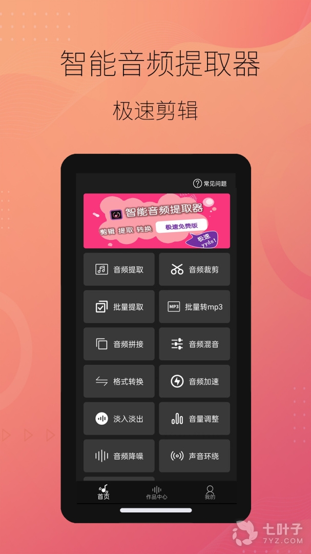 智能音频提取器app是一款专业的音频智能提取软件,操作方法简单,智能音频提取器app可以帮助用户随时导入各种视频内容,将视频里面的音频进行提取保存,除此之外,还有各种音频处理工具可以使用,包含了音频裁剪、格式转换、拼接和混音等功能。