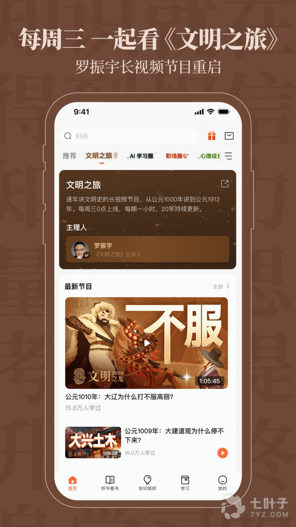3、如今,随着知识付费一波又一波的热潮,在知识付费市场如此庞大的情况下,该如何寻找适合自己的学习App呢?今天小编为大家介绍一款好用的手机学习App——得到。得到以“终身学习”为产品口号,构建“碎片化学习”的理念,打造严肃型知识付费平台,使用户利用碎片时间不断充实自己