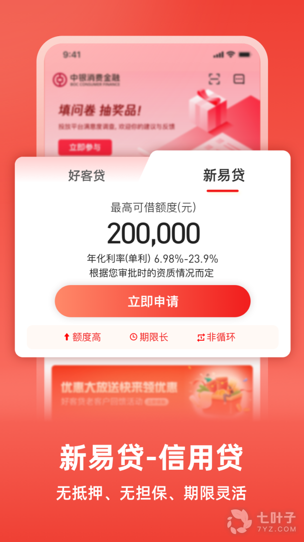 1、中银消费金融是一个纯贷款平台,这是中银消费金融有限公司推出的人性化在线借贷软件,无需抵押,用户只需要提供身份证信息和银行卡,最高可贷20万。用户可根据自身情况快速申请,平台很完全可以放心使用