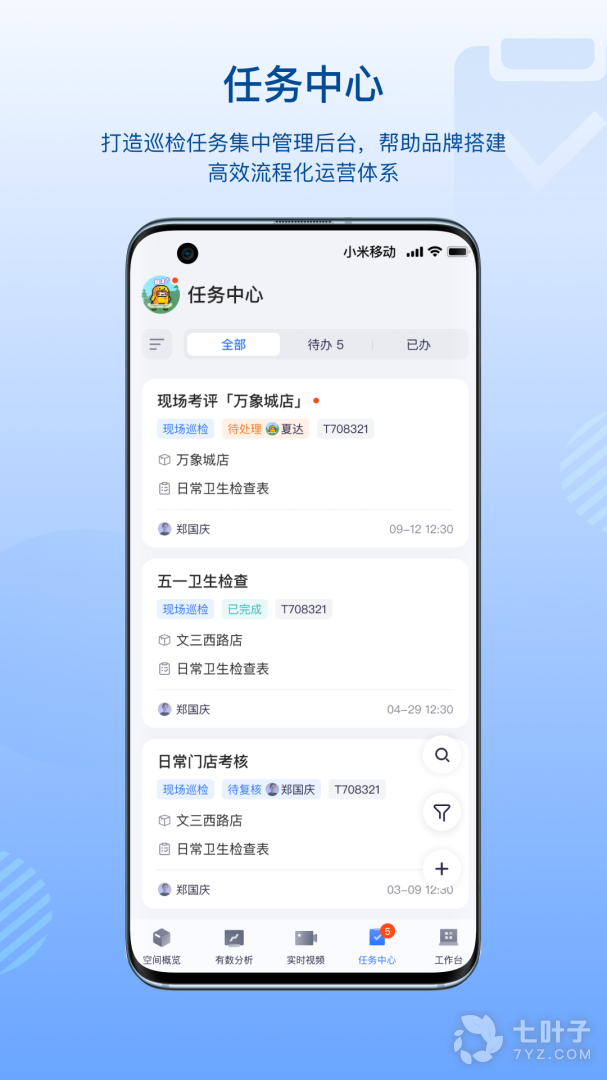基于检测物品摆放、油污检查、非法入侵、脱岗巡查等多种业务需求场景,根据预设标准进行自动巡检,及时发现问题并在 PC 端、移动端向管理人员推送任务通知,提升问题处理效率。