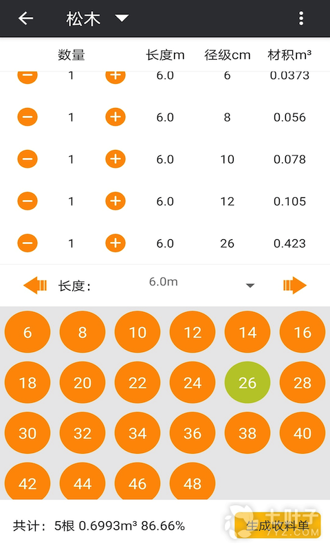 6、使用时输入材长、件数点击计算按钮可得到木材材积,径级、材长可根据需要任意调整