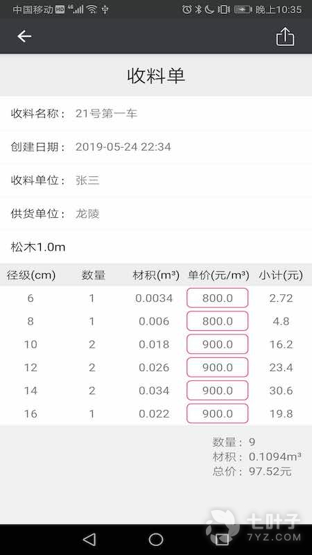 3、可设置不同树种不同长度不同径级的价格,最终快速计算总价,分类清晰结果明确,可分享计算结果