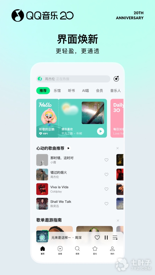 3、其操作简单、丰富地歌词显示、清爽的界面,配合多种声音效果,不仅支持本地音乐播放更有海量音乐曲库任你点播,丰富的推荐榜单助您冲浪在流行浪潮的前沿,马上下载软件听周杰伦的最新单曲说好不哭吧