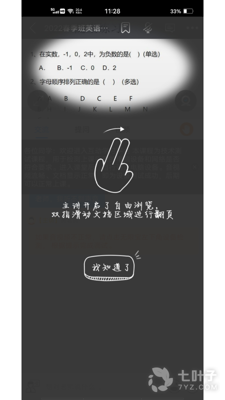 5、 开始上课后,可以缩放屏幕、提问、举手,响应老师的检测