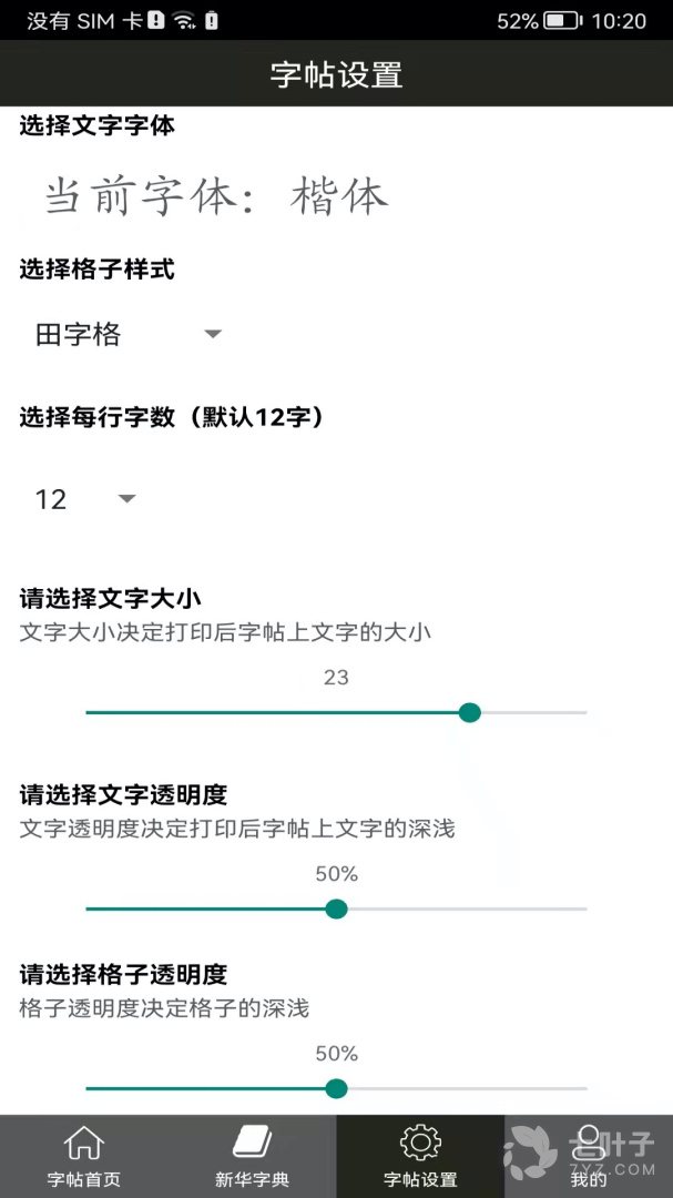 2、打印字帖文字字体支持设置,支持多种字体:楷体、行楷、硬笔行书、隶书、小篆、新宋体、流行简体、少女字体等