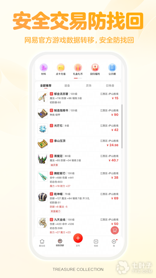 1、网易藏宝阁,就是官方给出的一款手游交易平台。支持网易的各种手机游戏外,还能够让你们快速的登录,直接在安全可靠的环境下进行交易,其次还自带了解官方发布的活动功能,让你们不在错过任何信息