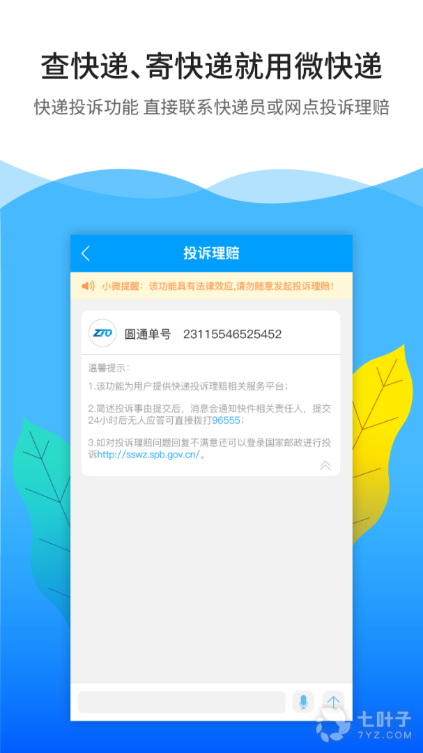 6、消息中心:主动推送快递跟踪信息,并支持给网点留言,助您迅速解决各类异常问题。