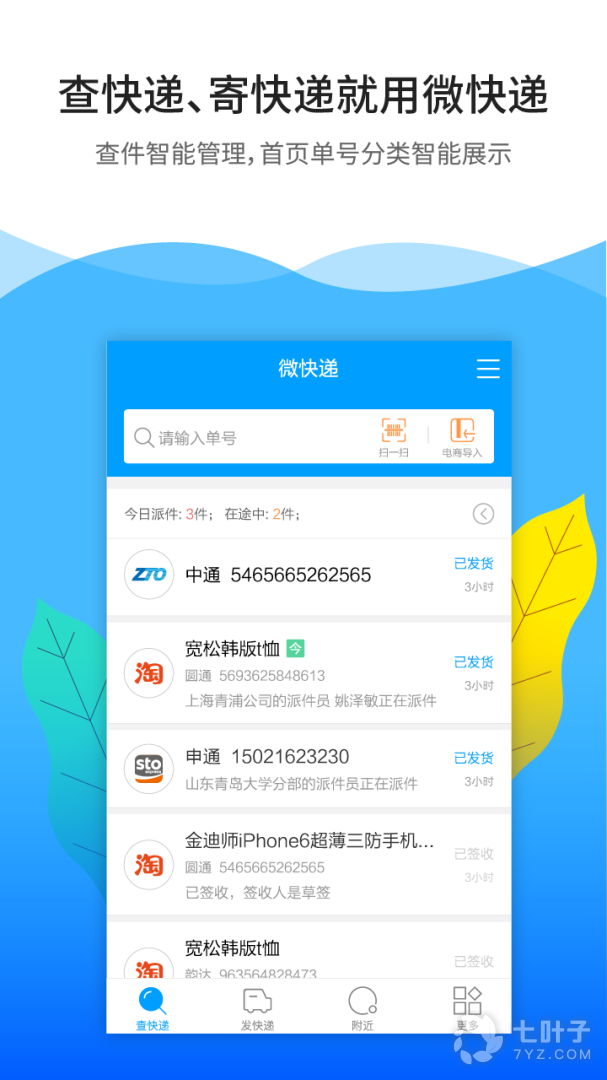 3、智能快递查询:无需选择快递公司,直接输入快递单号或扫描条形码即可查询快件跟踪信息及签收状态,支持国内数十家快递品牌如:申通、ems、顺丰、圆通、中通、韵达、天天、汇通、宅急送等;