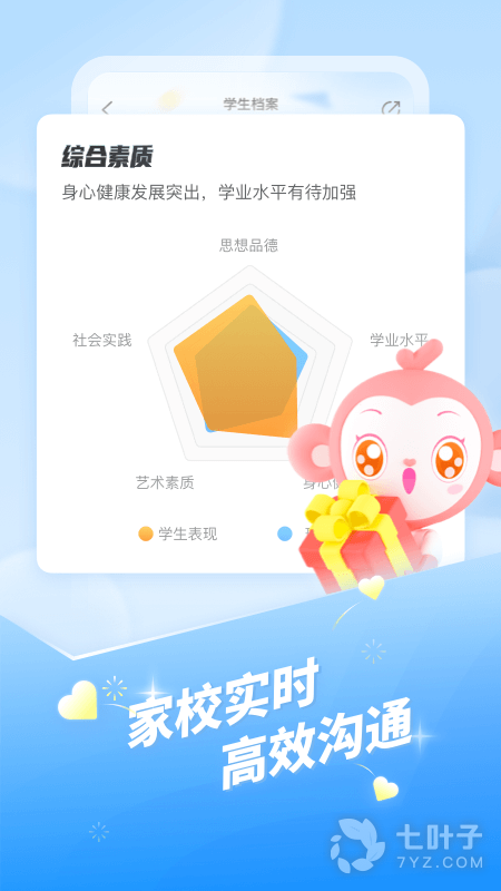 1、学生档案:依据老师评价数据,为学生表现报告和综合素质评价雷达图,让老师家长直观了解学生优势和不足,感知学生每一次成长。