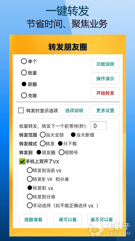 微商朋友圈一键转发:朋友圈动态一键转发、批量转发、自动跟踪转发、多微信号同步转发等功能,支持微信双开。