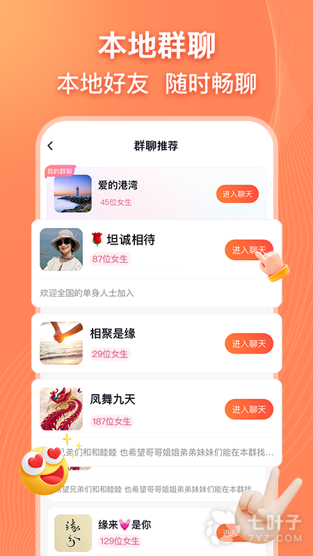 1、本地交友群本地好友随时畅聊,现在也能多人视频房实时互动温暧陪伴;