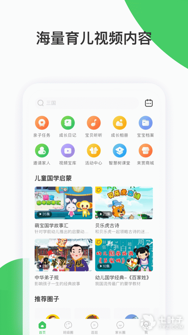 智慧树,主要为家长提供一个分享和记录孩子成长的云平台,系统中有海量的优质教学资源,供家长为宝宝随时随地随需选取;家长可通过家长端APP随时了解宝宝在幼儿园的精彩时刻;及时与老师、园长、班级圈互动;了解幼儿园最新通知和动态;家人们互邀共同记录孩子精彩的成长瞬间,为宝宝留下一笔宝贵的成长财富。照片、文字、声音、视频充分满足家长心理需求。搭建了家长与园长及教师之间沟通新桥梁,共育新方式,使家长与幼儿园彼此更信任、家长与孩子心灵更贴近。