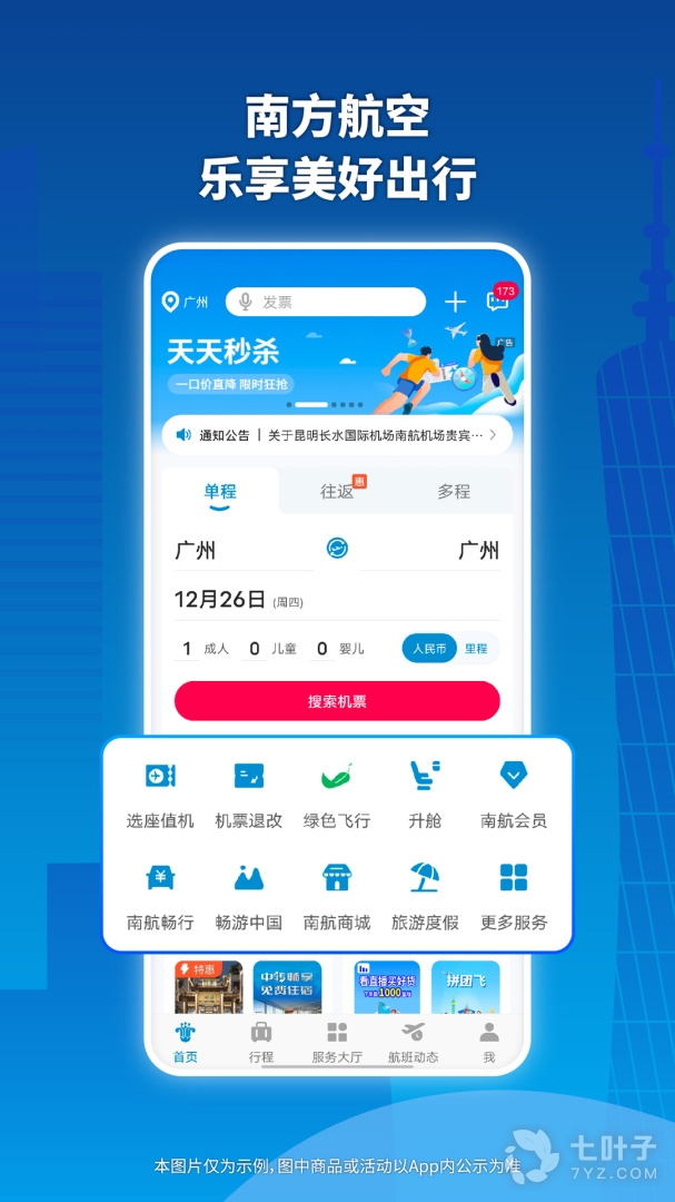 4、南方航空由中国南方航空股份有限公司推出,南方航空功能非常全面可以帮助用户进行机票预订、办登机牌、查看行程、航班动态、里程查询、客票验真等