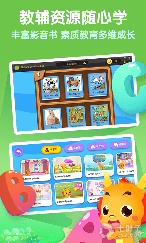小伴龙英语——1亿家长信赖,深受孩子喜爱的小伴龙带来了全新英语世界,邀请孩子一起前来探索!科学分龄的人教版英语同步课,丰富益智的美国专业RAZ绘本,原创精彩的英文动画,好玩有趣的互动故事,给孩子打造一个有趣有益的英语浸泡环境,让孩子从小爱上英语。