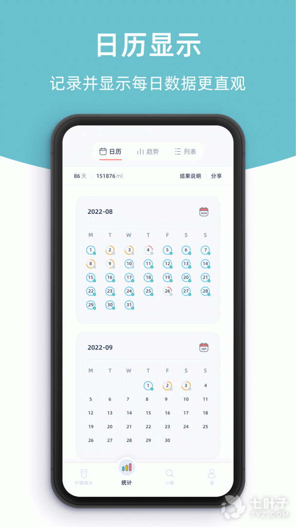 4、趋势统计 - 观察每日喝水走势不担心, 我们提供日历和趋势图两种呈现方式, 帮您最有效的制定喝水计划和展示您的喝水记录