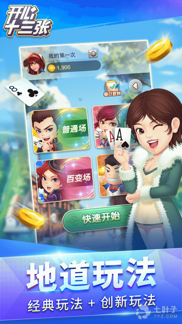 4、经典地道开心十三张,玩法齐全;经典模式、比赛场、好友同玩,各种玩法等你来战